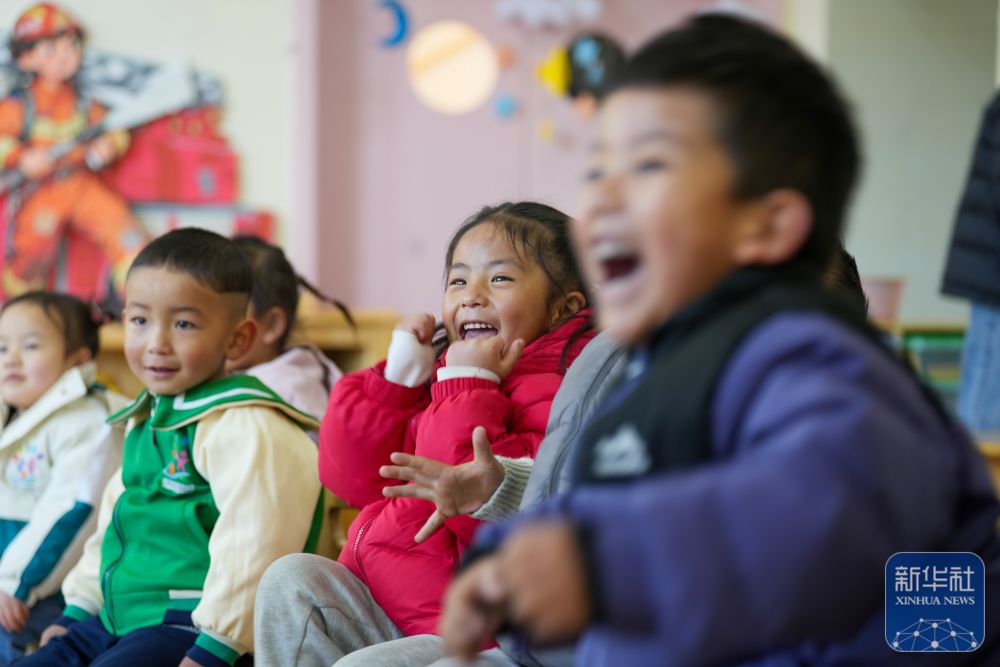 ↑ 3月2日,在西藏拉萨市江苏实验幼儿园,孩子们在教室里唱儿歌。
