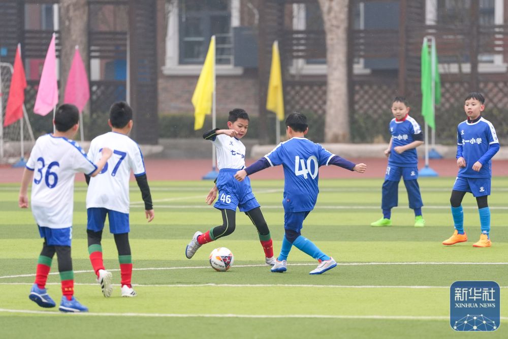 ↑ 3月2日,北京市海淀区七一小学学生在“浪花杯”班级足球联赛中拼抢。