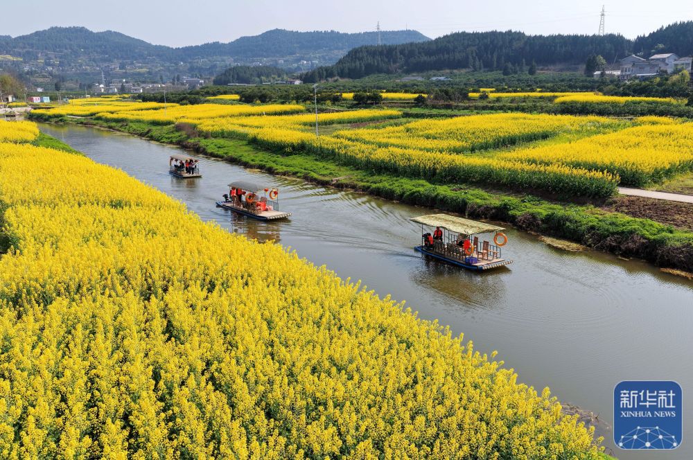 ↑ 3月5日,游客在四川省南充市蓬安县正源镇石牛村乘坐游船赏花游玩(无人机照片)。新华社发(刘永红摄)