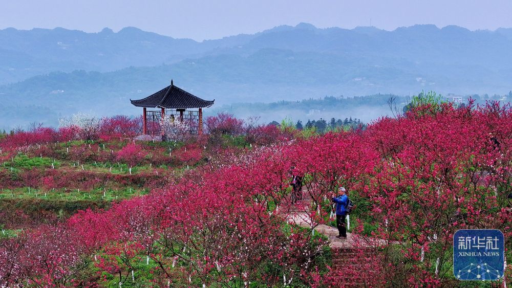 ↑ 3月5日,游客在四川省泸州市纳溪区上马镇的桃林里赏花游玩(无人机照片)。新华社发(廖胜春摄)