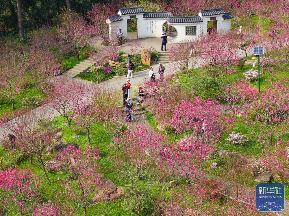↑ 3月4日,游客在广西南宁市青秀山风景区桃花坞踏青赏花(无人机照片)。新华社发(刘峥摄)