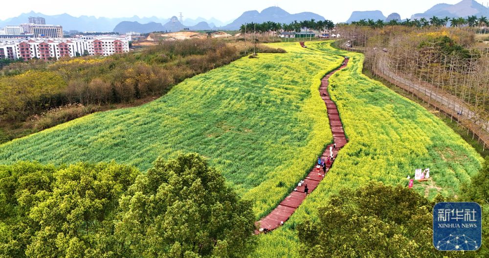 ↑ 3月5日,游客在广西来宾市忻城县的油菜花田中游玩(无人机照片)。新华社发(樊绍光摄)