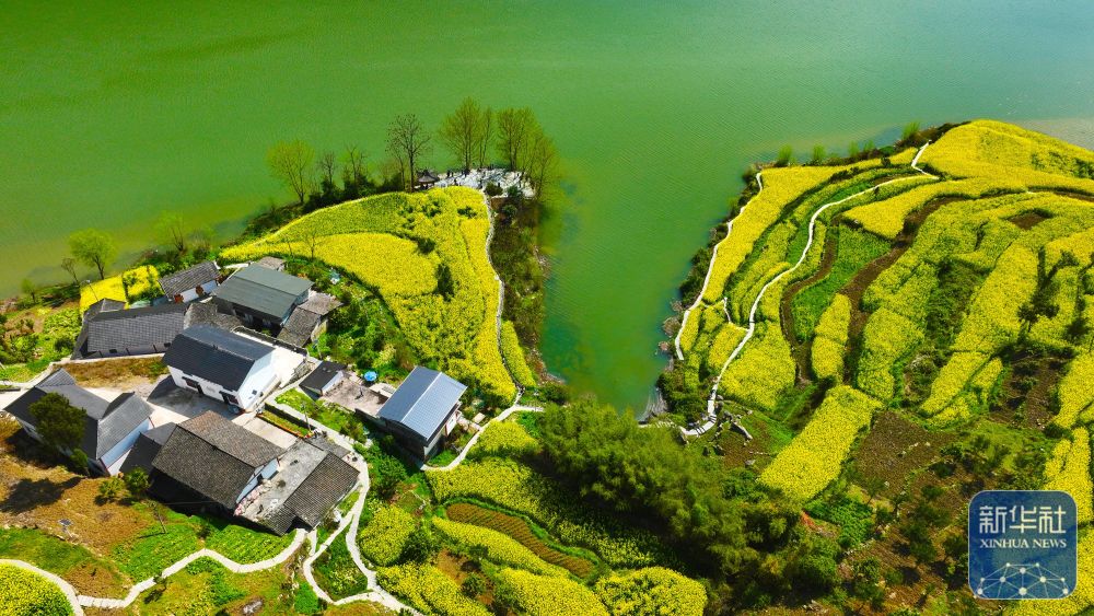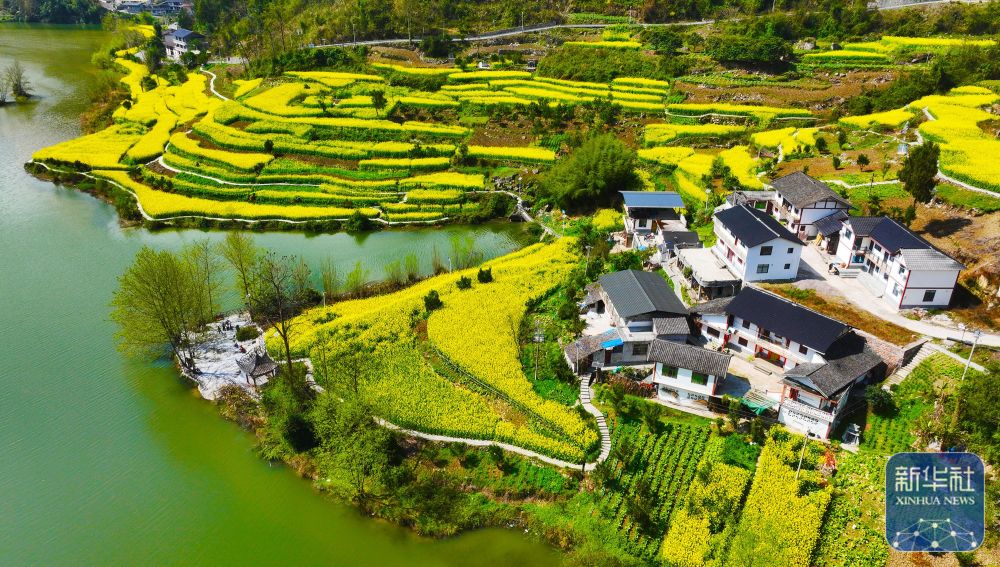 ↑ 重庆市黔江区阿蓬江镇大坪村油菜花开放(3月4日摄,无人机照片)。新华社发(杨敏摄)