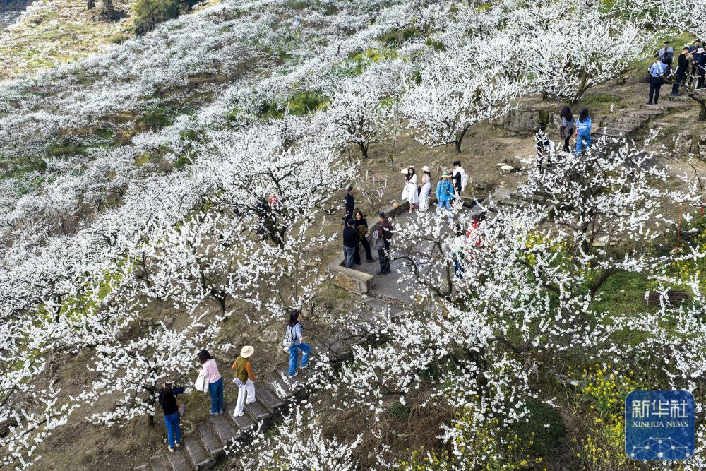 ↑ 3月4日,游客在重庆市北碚区统景镇印盒李花生态旅游区游玩(无人机照片)。新华社发(秦廷富摄)