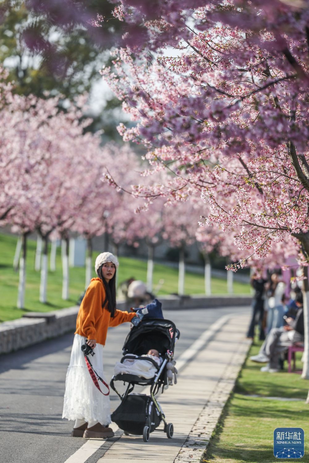 ↑ 3月10日,游客在花田美地景区的樱花林中游览。