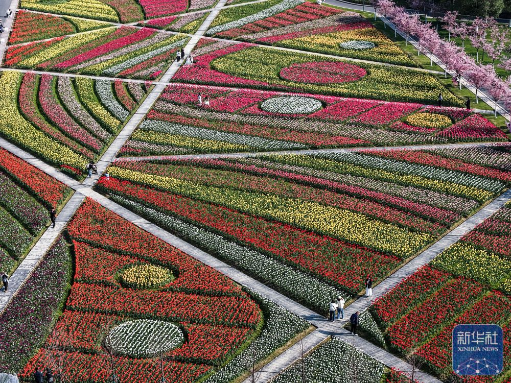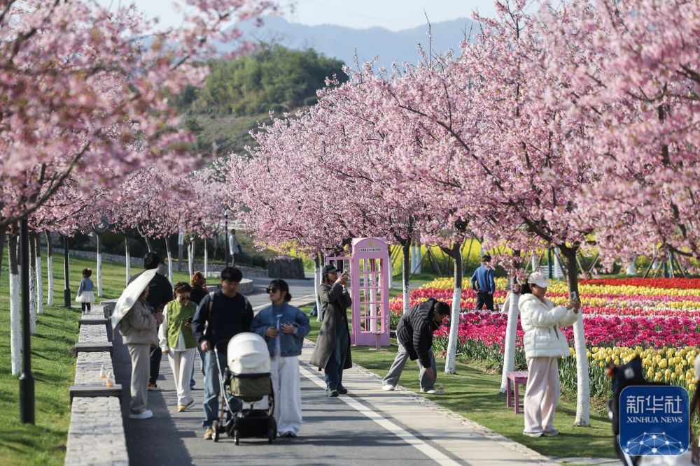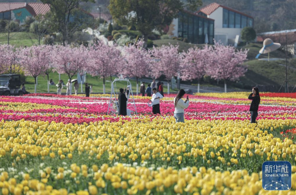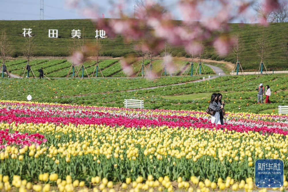 花田美地景区是浙江省金华市武义县王宅镇的特色乡村旅游项目。近日,景区花海进入盛花期,金黄色的油菜花与粉色樱花、多彩郁金香等共同构成春日美丽画卷,吸引游客前来打卡游玩。