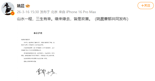 3月16日,演员姚晨在社交平台发文:山水一程,三生有幸。缘来缘去,皆是欢喜。(姚晨曹郁共同发布)