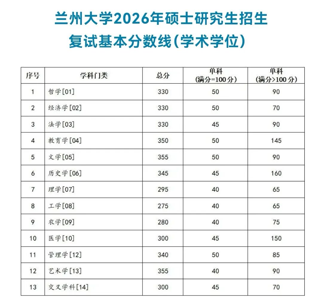 3月16日,兰州大学2026年硕士研究生复试分数线正式公布。