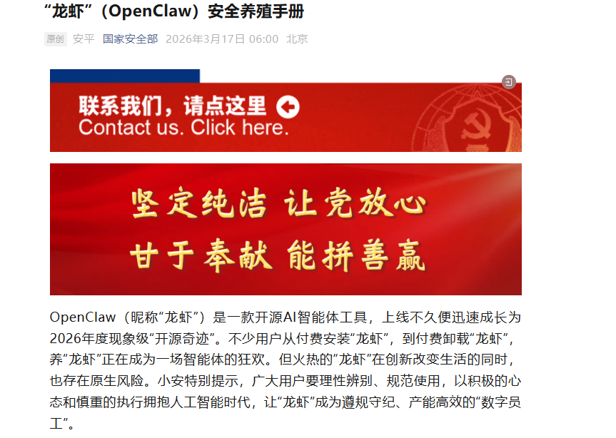 OpenClaw(昵称“龙虾”)是一款开源AI智能体工具,上线不久便迅速成长为2026年度现象级“开源奇迹”。不少用户从付费安装“龙虾”,到付费卸载“龙虾”,养“龙虾”正在成为一场智能体的狂欢。但火热的“龙虾”在创新改变生活的同时,也存在原生风险。小安特别提示,广大用户要理性辨别、规范使用,以积极的心态和慎重的执行拥抱人工智能时代,让“龙虾”成为遵规守纪、产能高效的“数字员工”。