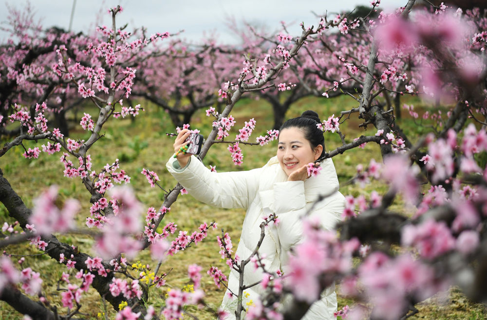 ↑3月16日,游客在贵州省贵阳市南明区永乐乡万亩桃园内拍照打卡。新华社发(赵松 摄)
