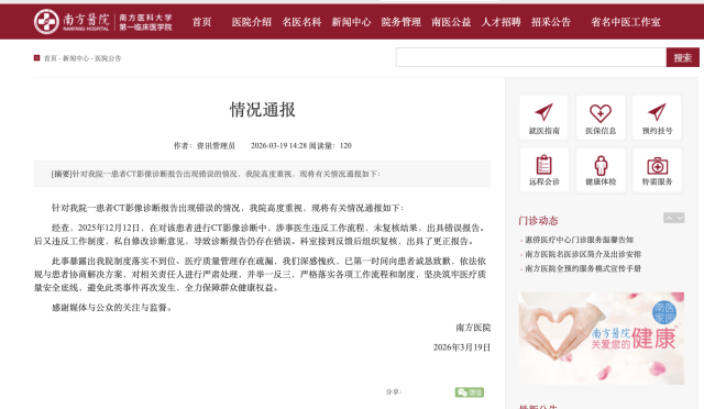 19日,南方医院发布情况通报:经查,2025年12月12日,在对该患者进行CT影像诊断中,涉事医生违反工作流程,未复核结果,出具错误报告。后又违反工作制度,私自修改诊断意见,导致诊断报告仍存在错误。科室接到反馈后组织复核,出具了更正报告。