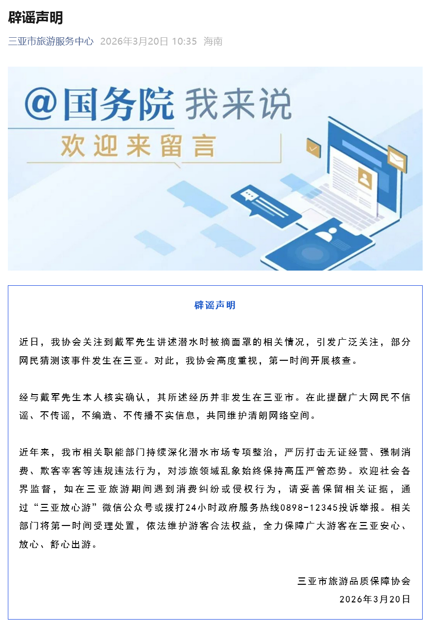 3月20日,三亚市旅游品质保障协会发布辟谣声明: