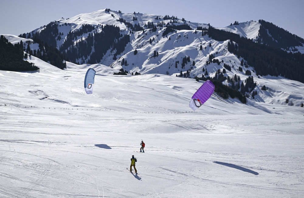 在新疆伊犁河谷东部山区,程鹏和同伴们进行风筝滑雪(3月14日摄)。新华社记者 胡虎虎 摄