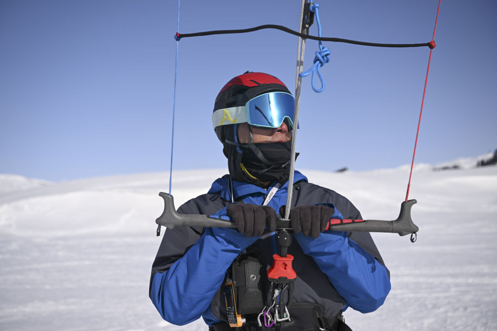 滑雪者手持的是风筝滑雪控制手柄,其设置有快速脱离装置。新华社记者 胡虎虎 摄