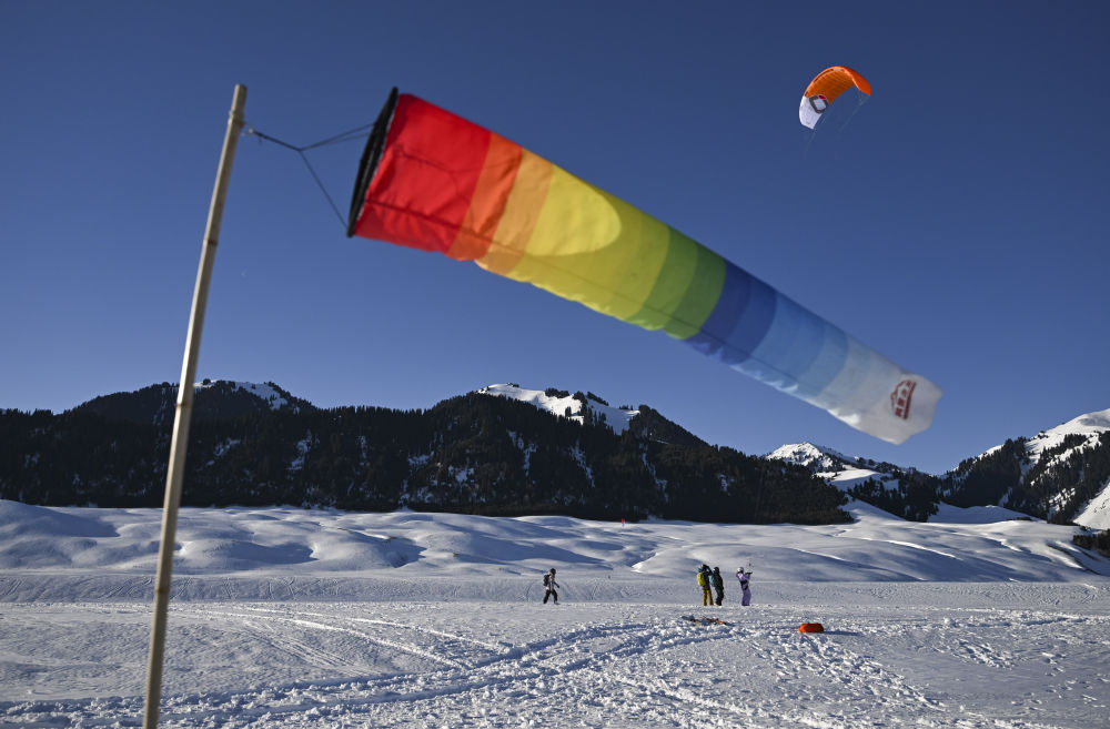 滑雪者利用风筝上坡。新华社记者 卢星吉 摄