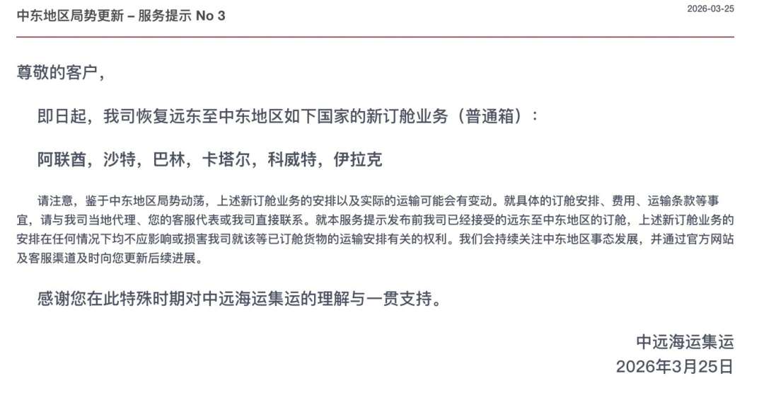 据央视财经:3月25日,中远海运集运宣布,即日起恢复远东至中东地区多个国家的新订舱业务(普通箱),包括阿联酋,沙特,巴林,卡塔尔,科威特,伊拉克。