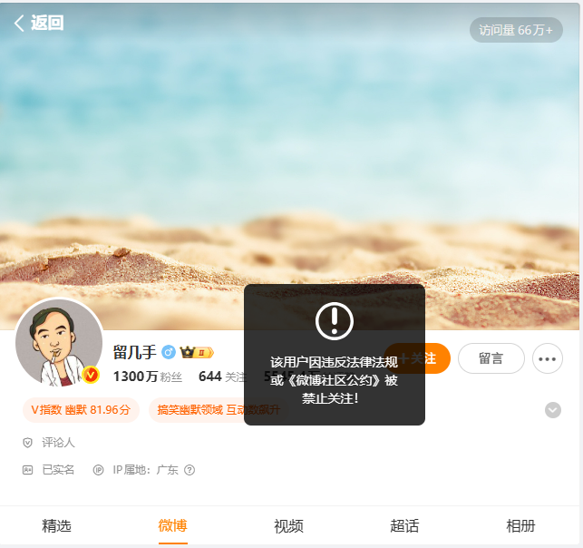千万粉丝大V“留几手”微博账号,被禁止关注