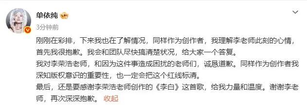 我对李荣浩老师,和因为这件事造成困扰的老师们,诚恳道歉。同样作为创作者我深知版权意识的重要性,也一定会把这个红线标清。