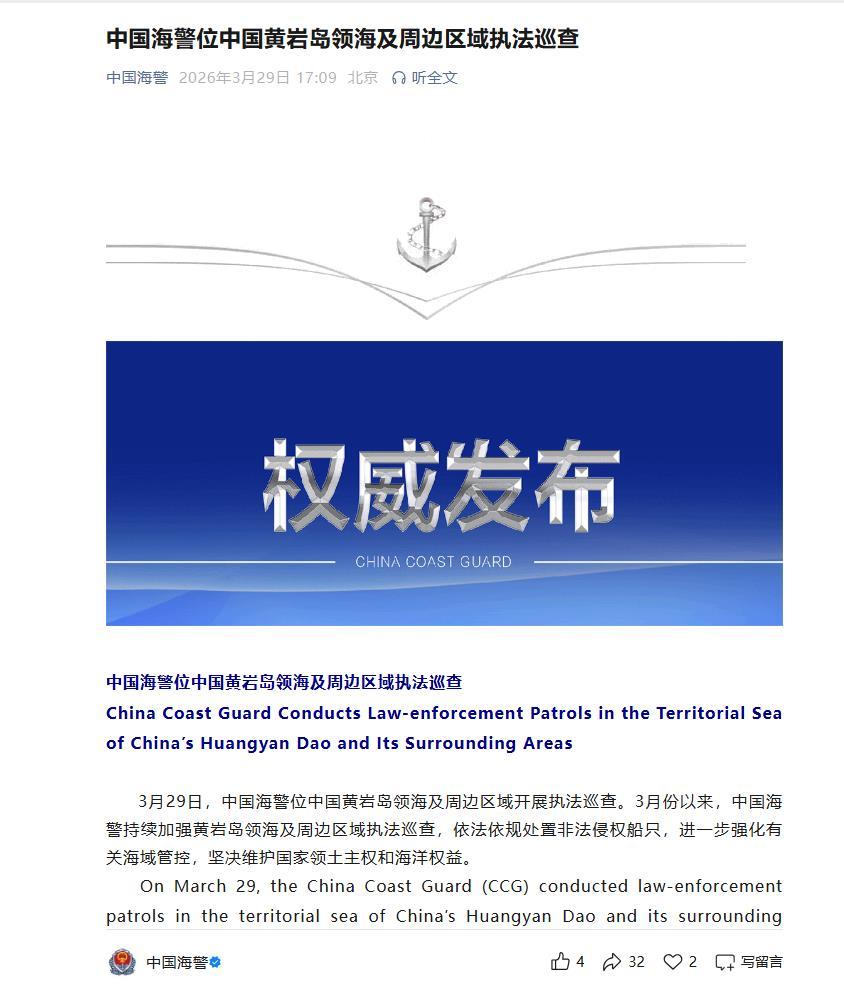 3月29日,中国海警位中国黄岩岛领海及周边区域开展执法巡查。3月份以来,中国海警持续加强黄岩岛领海及周边区域执法巡查,依法依规处置非法侵权船只,进一步强化有关海域管控,坚决维护国家领土主权和海洋权益。