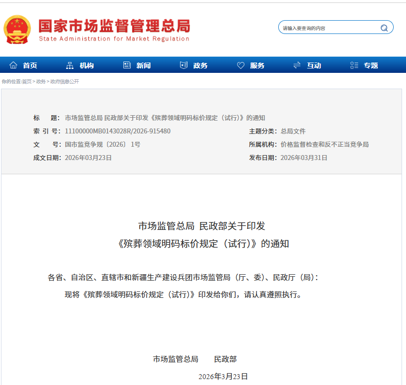 《殡葬领域明码标价规定(试行)》的通知