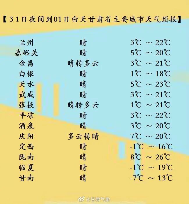 4月2日夜间到4月3日白天(4月2日20时-4月3日20时),临夏、甘南两州阴间多云,局部地方有小雨(雪)或雨夹雪;省内其余地方晴或多云。另外,武威、白银、平凉、庆阳、甘南等市州有5级左右西北风,局部地方有沙尘。受冷空气影响,河西西部气温明显下降。