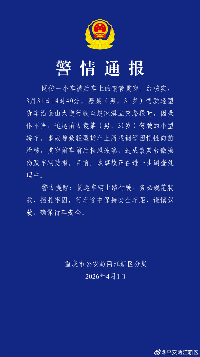 重庆警方通报“小车被后车钢管贯穿”:男子因操作不当追尾前车,所载钢管向前滑移贯穿前车挡风玻璃