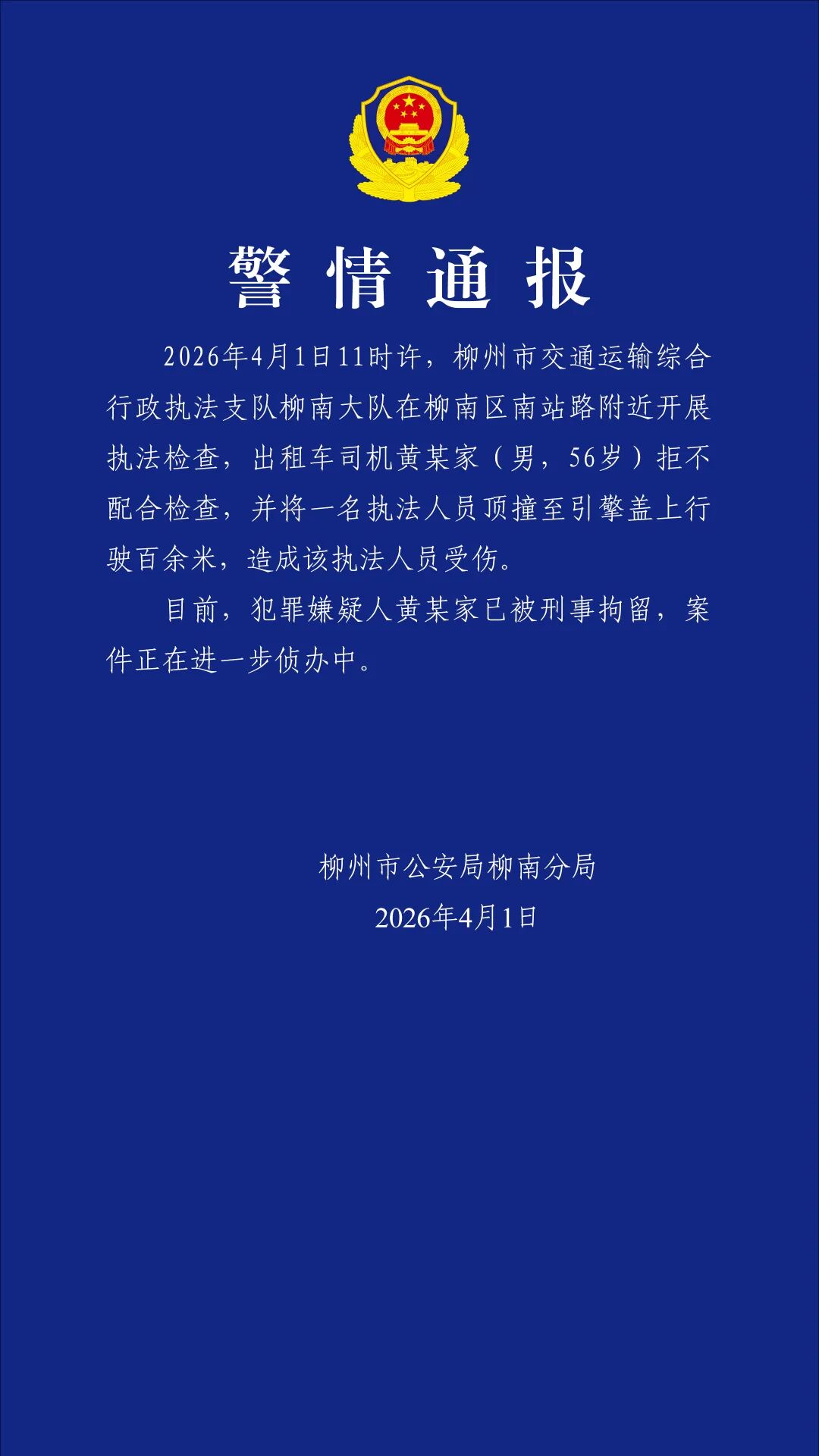 4月1日11时许,柳州市交通运输综合行政执法支队柳南大队在柳南区南站路附近开展执法检查,出租车司机黄某家(男,56岁)拒不配合检查,并将一名执法人员顶撞至引擎盖上行驶百余米,造成该执法人员受伤。