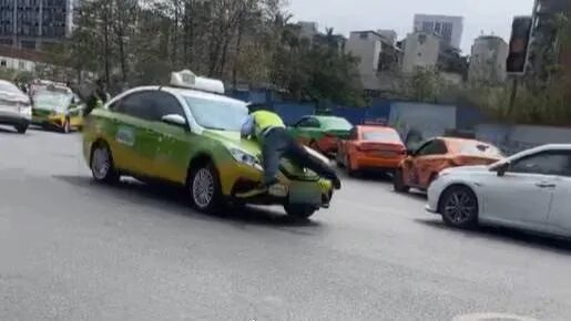 此前,据媒体报道,4月1日,一段出租车将一名身着制服人员顶在引擎盖前行的视频,在广西柳州出租车司机微信群里热传。视频显示,一辆黄绿相间的出租车顶撞着一名身着制服的男子在路上先是减速后又加速行驶,情形十分危险。
