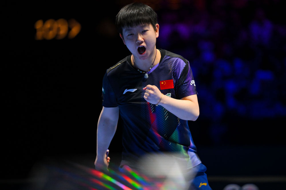 4月1日,中国队选手孙颖莎在比赛中庆祝得分。新华社发(张金加 摄)