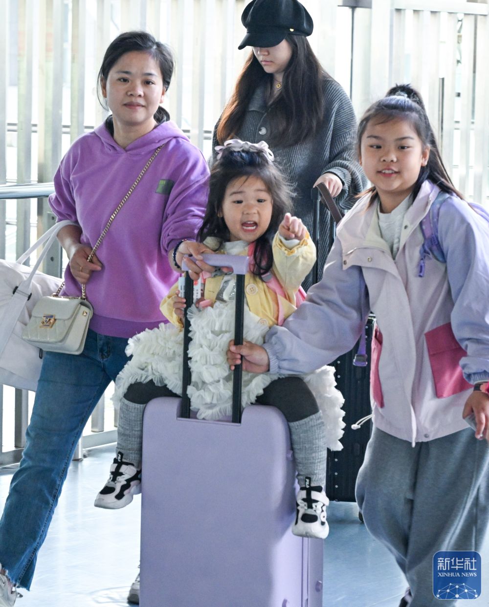 ↑ 4月1日,小朋友在家长陪同下从南京火车站出行。新华社发(杨素平摄)