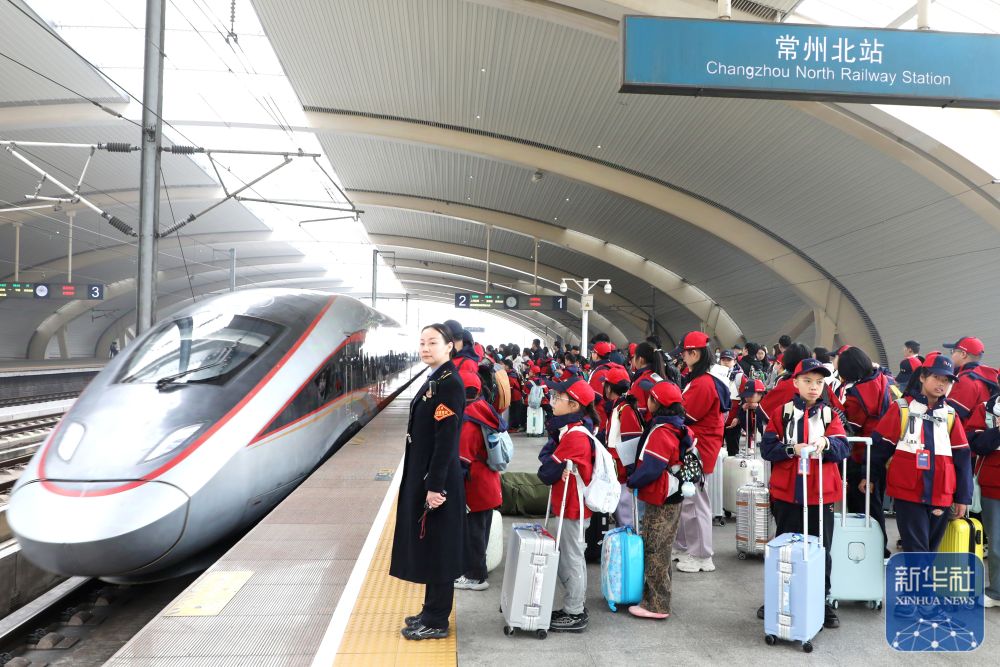 ↑ 4月1日,学生们在江苏常州北站乘坐高铁外出旅行。新华社发(陈暐摄)