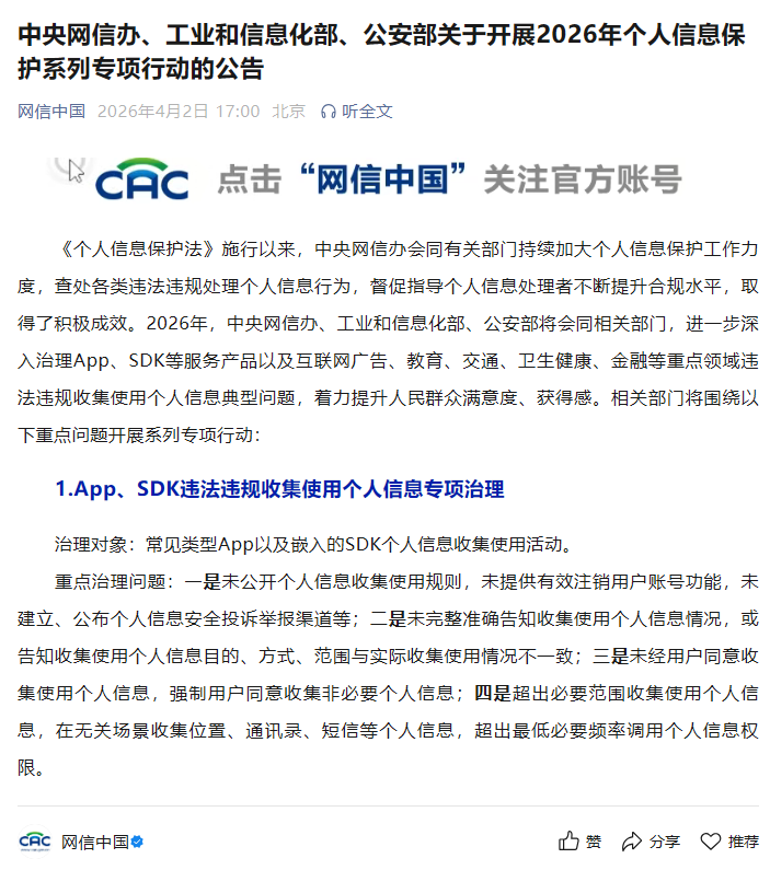 原标题:中央网信办、工业和信息化部、公安部关于开展2026年个人信息保护系列专项行动的公告