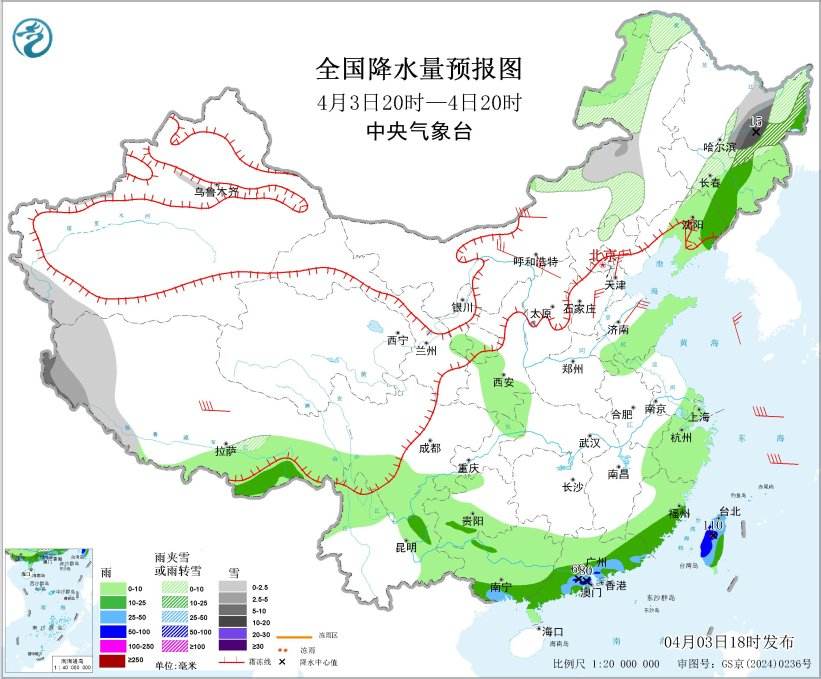3日20时至4日20时,内蒙古中东部、黑龙江中东部、吉林西部、新疆沿天山一带和南疆南部、西藏西部等地部分地区有小到中雪或雨夹雪,其中,黑龙江中部、西藏西南部等地部分地区有大到暴雪。吉林中部、辽宁东部、西藏东南部、福建南部、广东南部、广西南部、云南东北部、贵州南部、台湾岛等地部分地区有中到大雨,其中,广东南部沿海、台湾岛中西部等地部分地区有暴雨或大暴雨。