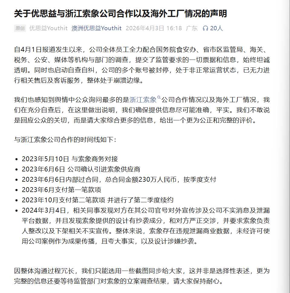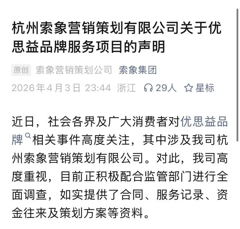 4月3日深夜,杭州索象营销策划有限公司就优思益品牌相关舆情发布官方声明,称正积极配合监管部门调查,并就合作边界、宣传行为及央视报道相关内容作出澄清与致歉。