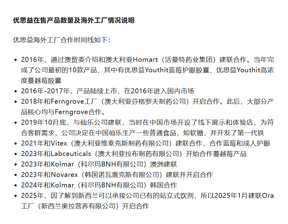 在4月3日的最新声明中,优思益对与仙乐健康的合作进行补充说明:2019年10月底,与仙乐公司建联,当时在中国市场开设了线下展示和体验店,为符合客群需求,公司决定在中国仙乐生产一些普通食品,如软糖,并开发了第一代铁。