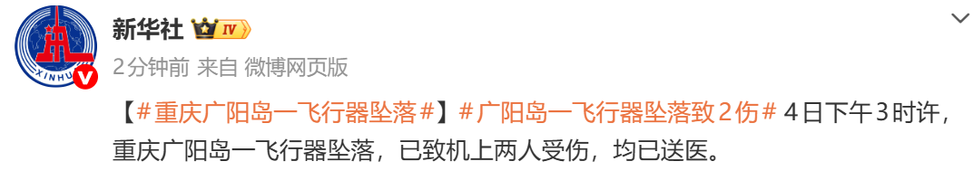 此前据新华社,4日下午3时许,重庆广阳岛一飞行器坠落,已致机上两人受伤,均已送医。