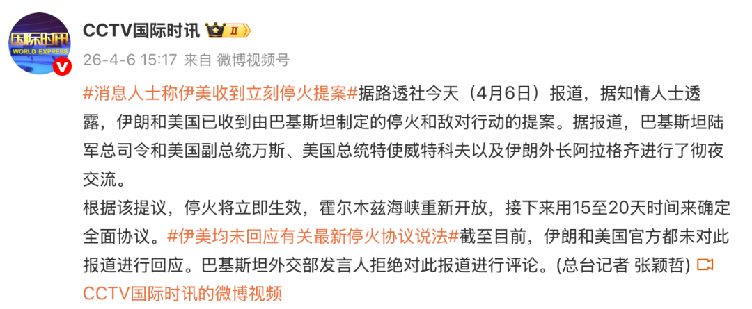 据路透社今天(4月6日)报道,据知情人士透露,伊朗和美国已收到由巴基斯坦制定的停火和敌对行动的提案。据报道,巴基斯坦陆军总司令和美国副总统万斯、美国总统特使威特科夫以及伊朗外长阿拉格齐进行了彻夜交流。