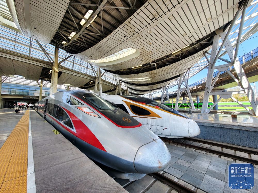 ↑ 4月6日,列车停靠在北京南站。新华社记者 邢广利 摄