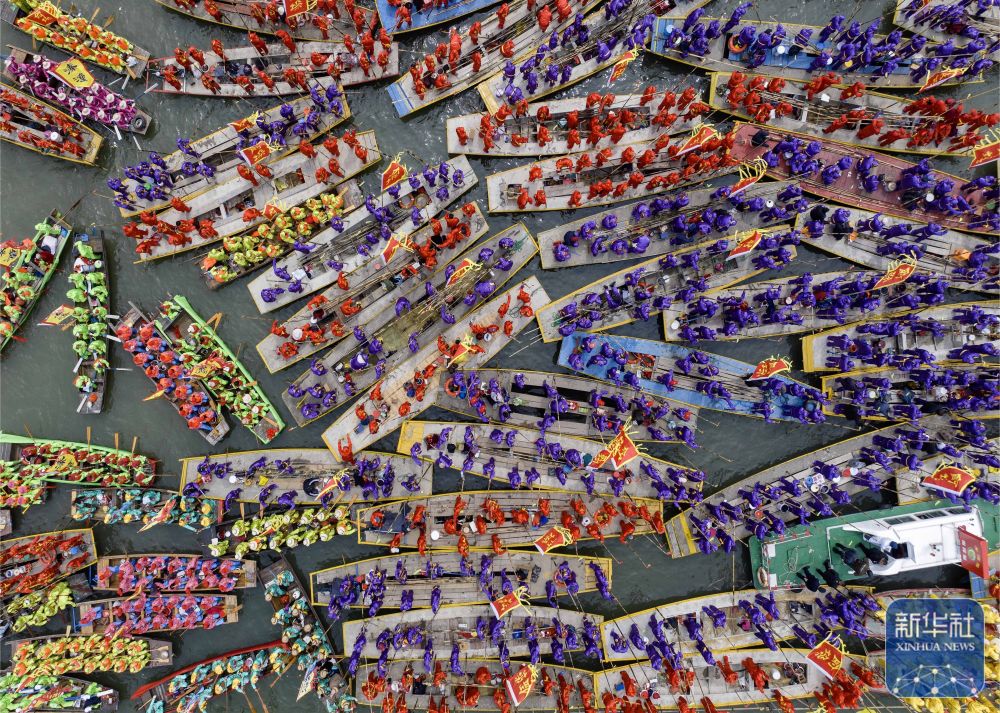 ↑ 4月6日,参加会船表演的船只云集溱湖(无人机照片)。新华社发(汤德宏 摄)