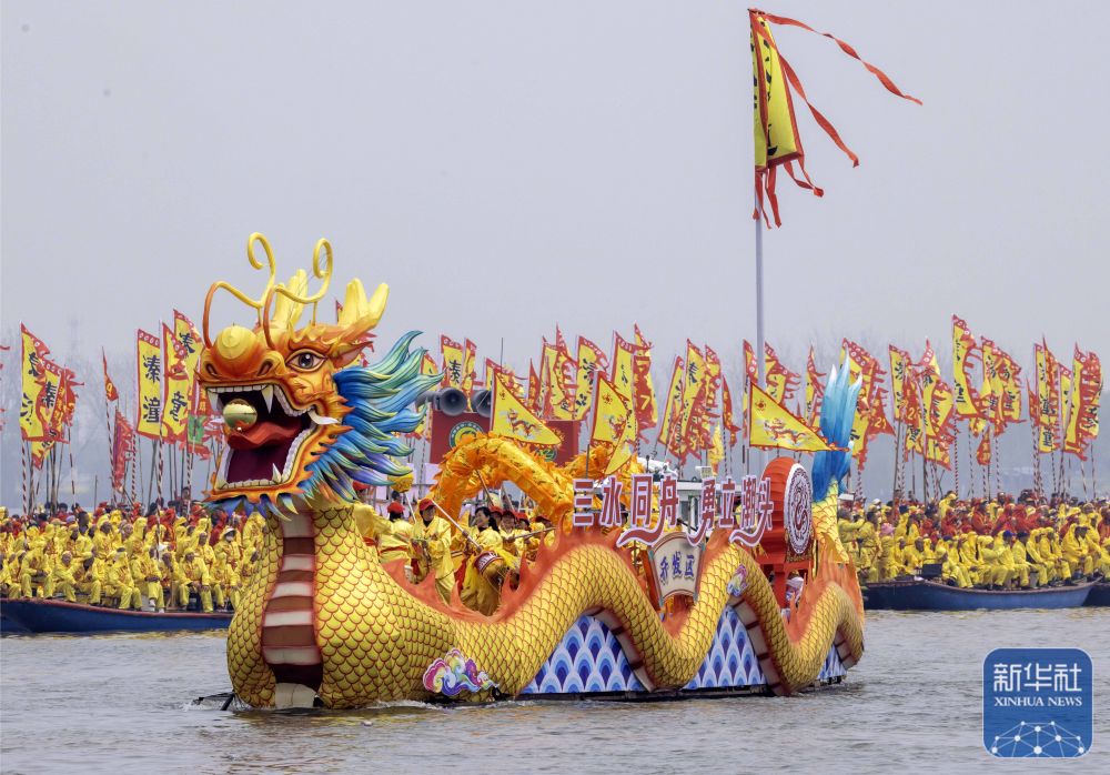 ↑ 4月6日,参加会船表演的选手在龙舟上舞龙。新华社发(汤德宏 摄)