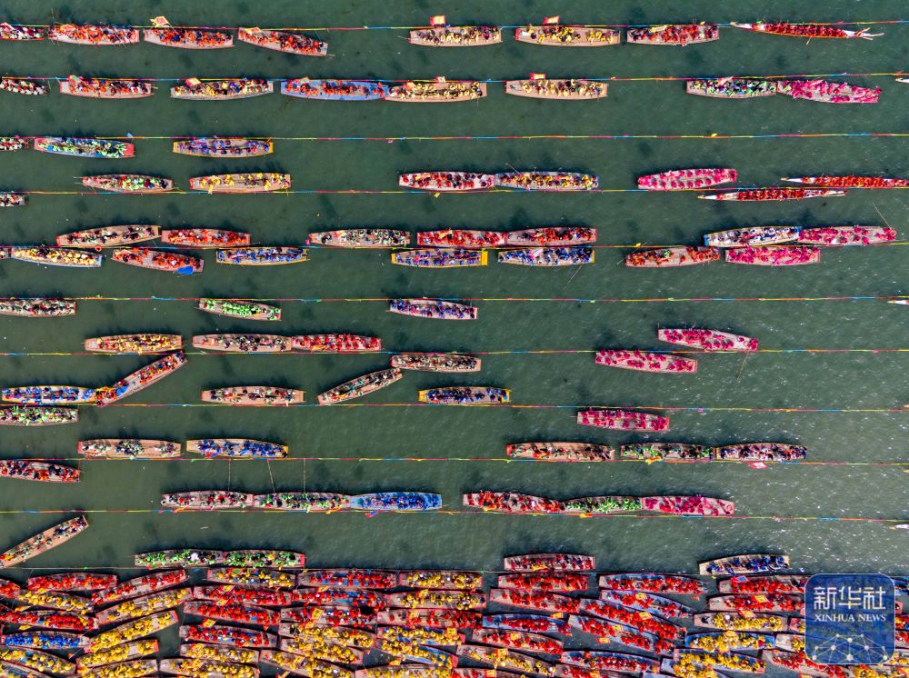 ↑ 4月6日,参加会船表演的船只整装待发(无人机照片)。新华社发(杨玉岗 摄)