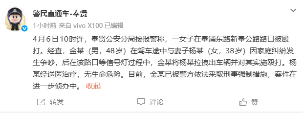 男子当街殴打妻子,上海奉贤警方通报——