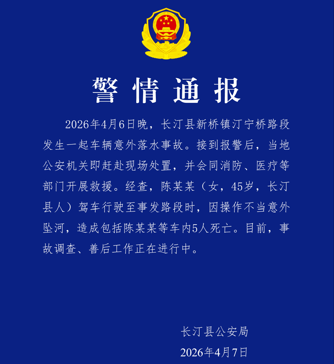 2026年4月6日晚,长汀县新桥镇汀宁桥路段发生一起车辆意外落水事故。接到报警后,当地公安机关即赶赴现场处置,并会同消防、医疗等部门开展救援。