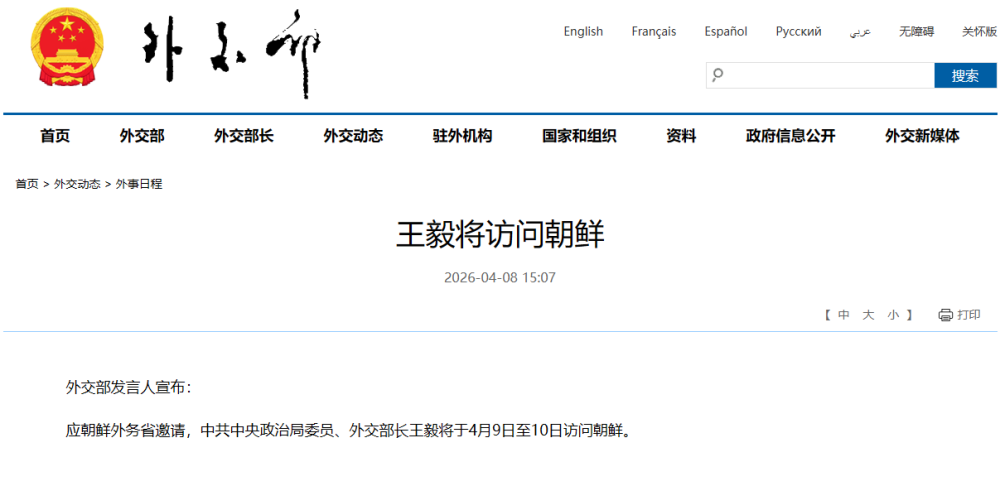 应朝鲜外务省邀请,中共中央政治局委员、外交部长王毅将于4月9日至10日访问朝鲜。