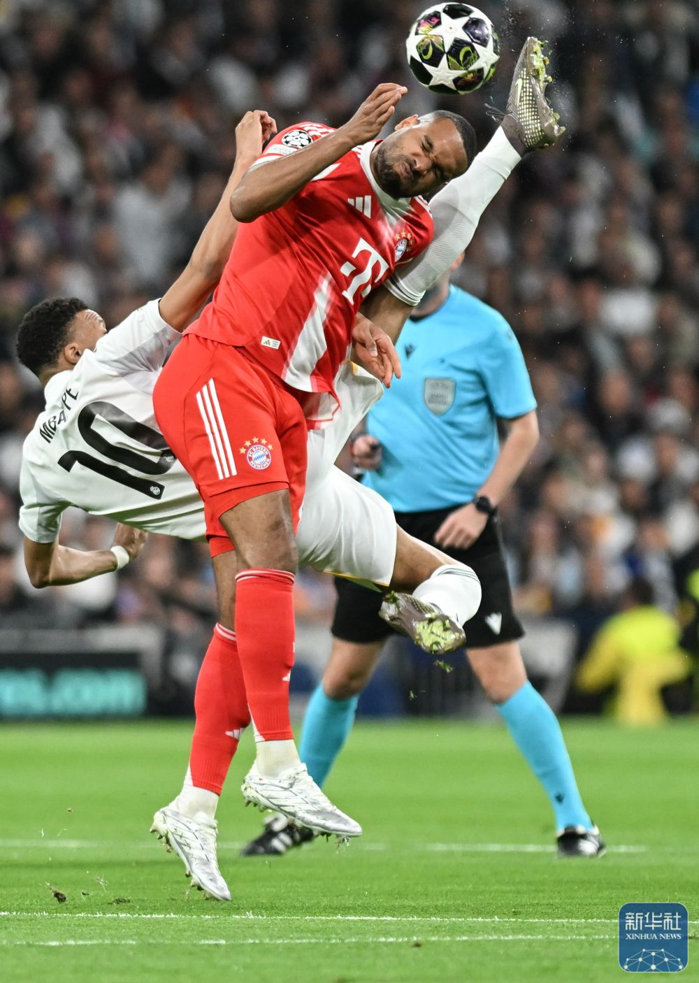↑ 皇家马德里队球员姆巴佩(左)与拜仁慕尼黑队球员约纳坦·塔在比赛中拼抢。