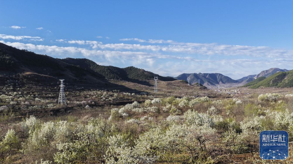 ↑ 4月8日在河北省遵化市铁厂镇拍摄的梨树沟春景(无人机照片)。新华社发(刘满仓摄)