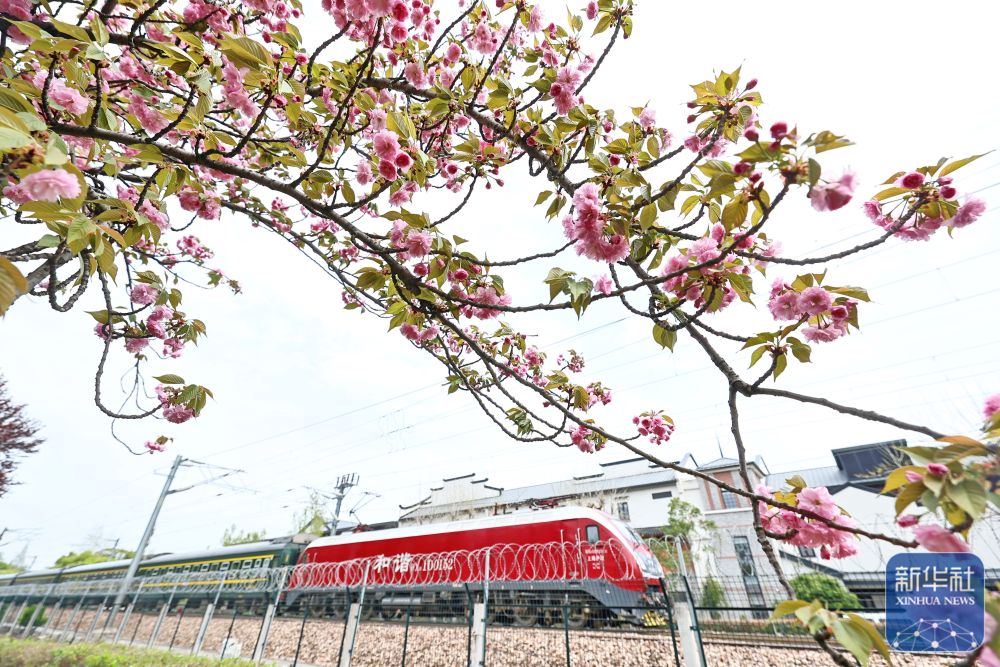 ↑ 4月8日,在浙江省嘉兴市南湖区,列车从樱花树旁驶过。新华社发(金鹏摄)