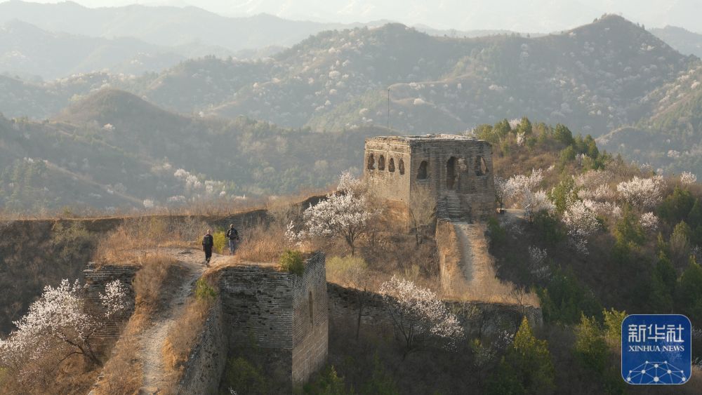 ↑ 4月8日,游客在北京市密云区古北口镇蟠龙山长城游览。新华社发(周万平摄)