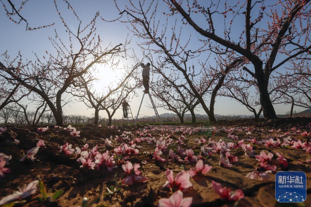 ↑ 4月7日,北京市平谷区王辛庄镇农民在果园为桃树疏花。新华社发(刘满仓摄)