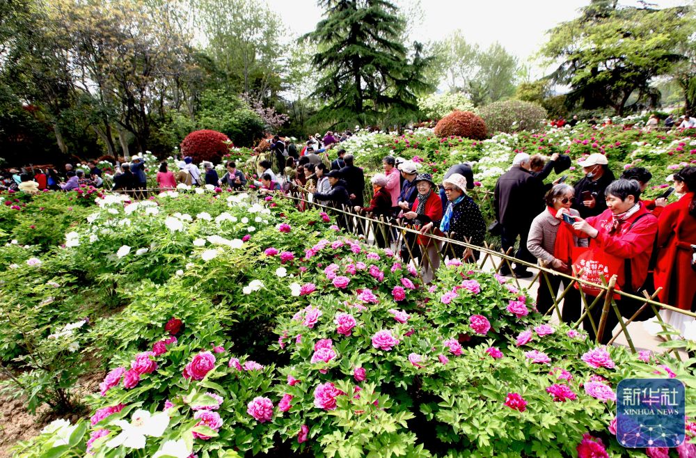 ↑ 4月8日,人们在江苏省徐州市云龙公园牡丹园赏花游览。新华社发(蒯创摄)